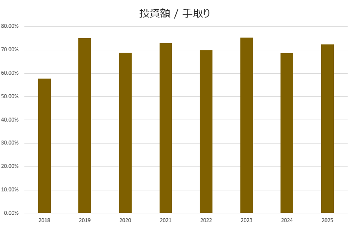 投資開始から記録をつけていますが、給料が低かった2018年を除けばおおよそ70%~80%を投資にまわしてきたのが分かります。